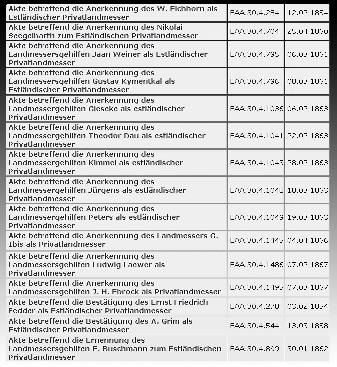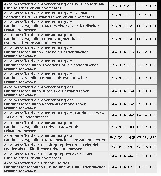 Eesti Ajalooarhiivis säilinud aktid eramaamõõtjateks kinnitamise kohta Pihkva maamõõdukool 1800 lõpp |