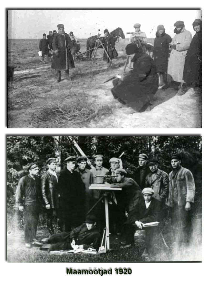 Rakvere maakorraldaja ning Virumaa vanem maakorraldaja Hans Persmann (Pärismaa) kirjeldab tolle aja maamõõduolu- sid Eestis järgmiselt: „Tehniline varustus koosnes 10 süllalisest jala pikkuste lülidega ahelast, mensulast (küllalt primitiivsest), sihtrauast (alidade) ja 50 süllasest tõrvatud nöörist, millele iga sülla tagant olid kinnitatud nahast lapatsid numbritega (viied ja kümned olid erikujulised). Suurema maa-ala mõõdistamine toimus järgmiselt: Raiuti lahti ja tähistati ristikivide või kupitsatega piirisihid. Mõisade ja külade vahelised piirid olid tihtipeale aetud looduslike märkide järele. Piirimärkidena oli kasutatud suuri kive, milledele ronimine teodoliidiga mõõdistamisel ja milledel töötamine oli tükk akrobaatilist tööd. Maa-ala keskelt, põhjast lõunasse, rajati läbi peasiht, mis ulatus piirist piirini. Peasihist rajati iga 50 sülla tagant põiksihid, mis eemaldusid peasihist täisnurga all ja ulatusid peasihist jällegi ringpiirini. Põiksihid vaiatati iga 50-ne sülla tagant, mõõdeti ahelaga (hiljem lindiga), põiksihtide otsade vahelised piirilõigud ja oligi valmis võrk üksikasjade mõõdistamiseks. See kõik kinnitati osade viisi plaani paberile, paber kinnitati mensula planšetile ja mindi üle põiksihi vaiadest. Peale ülemal kirjeldatud varustuse oli mõõdistajal veel 25 nummerdatud poole meetri pikkust vaia. Latipoiss kaasas, tähistas mõõdistaja kohapeal vaiadega ära kõik kõlvikute piirikäänakud ja märkis paberile vaiade suhtelise asendi ning kõlviku nimetuse. Latipoiss hakkas siis numeratsiooni järjekorras vaiasid pidi käima, vaiasid kokku korjama ja vahel ka kontrolliks vaia numbrit hõikama. Mensula juures sihtis mõõdistaja sihtrauaga vaiale, jooksupoiss lidus nööriotsaga vaiani ja hasplimees nimetas nööri pealt saadud kauguse, mis sirkliga märgiti plaanile. Haspel keerles püsti maa sisse löödud vaial ja sellele kruttis hasplimees nööri jälle tagasi. Kui latipoiss sattus võsaga kaetud kohta, karjus ta „hopp-hopp“ ja sihtimine ning nööri pingutamine toimus hääle peale. Lihtsamatel ja kättesaada- vamatel kohtadel käis latipoiss ilma tähistusvaiadeta. Selliselt käidi mensulaga läbi kõik põikisihtide vaiad ja saadi mõõdistamisplaan, mida tollel ajal nimetati conceptplaaniks. Conceptplaanilt kanti piirid ja ülesvõtted torgete abil suurele plaanipaberile, joonestati tušis, illumineeriti ja varustati pealkirjadega. Valmisplaanile kleebiti alla valge riie ja ääristati värvilisest riidest paelaga (lehed 2 x 1,5m) Eelpool kirjeldatud mõõdistamise grupi kaudu saadigi mõõdistajate juurdekasv. Jooksupoisist sai latipoiss, latipoisist maamõõtja abi, abist pärast mitmeaastast praktikat võimaldatava eksami kaudu vannutatud maamõõtja. Praktika all tuli mõista peale tehniliste oskuste ka määruste tundmist ja seltskondlikku lihvi. Maamõõtja teenis 150-200 krooni kuus, maamõõtja abi 80-100 krooni kuus, joonestaja-arvestaja 40-90 krooni kuus. (Staaşikas kantseleiametnik teenis tollal 70 krooni kuus).“ 1921 kinnitati Eesti Maamõõtjate Seltsi põhikiri. Ülevenemaalise Eesti Maamõõtjate Seltsi lõi maamõõtja ja poliitik Jakob Lukats 1908 aastal. Sellest arenes iseseisvuse ajal välja Eesti Maamõõtjate Selts. 1926 aastal kaotati Eestis kihelkonnad. 1927 21.oktoobril koostati Eesti Geodeetide Ühingu eestveda- misel „Maamõõtmise ja maakatastriplaanide valmistamise juhtnöörid“ mis avaldati samal aastal ka Riigi Teatajas (RT.102- 1927). See oli Eesti Vabariigi esimeseks regulatsioonidoku- mendiks, mis puudutas maamõõtmist ja katastriplaanide vormistamist ja millega sooviti katastrimõõdistamise valdkonda ühtlustada.